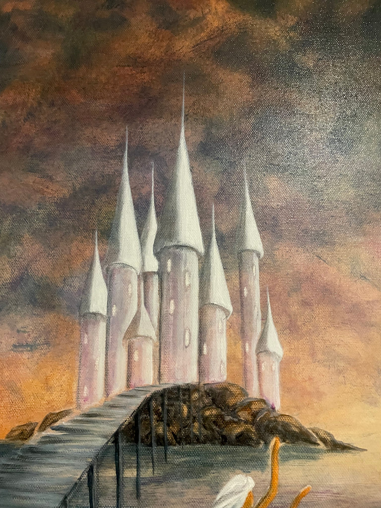 Bron till slottet var smal och tyst, men den väntade på dem som vågade tro. Grenarna ovanför viskade gamla sagor, och vågorna bugade sig försiktigt mot land.