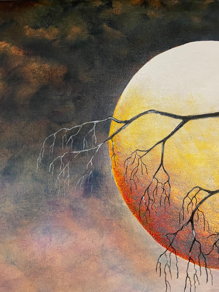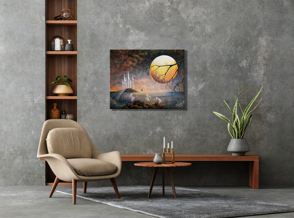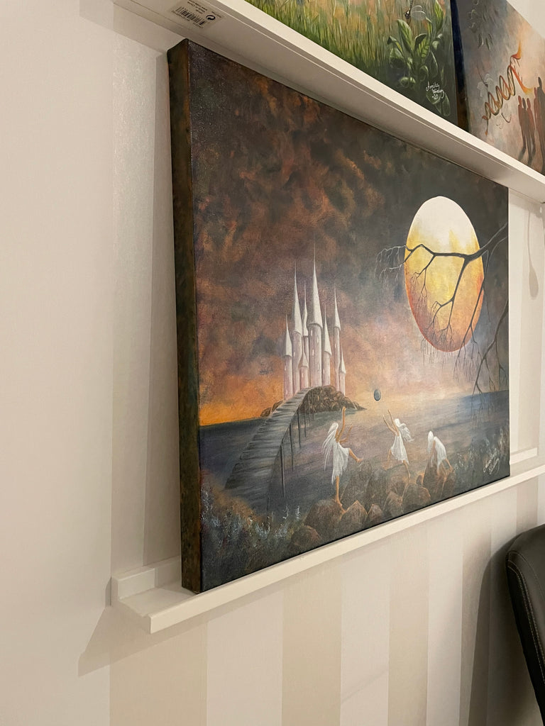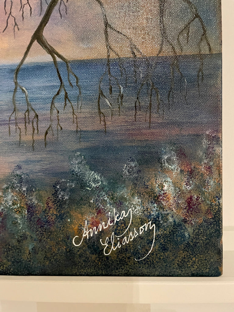 Original akrylmålning på 3D canvasduk, 80x60x3,5cm, målade kanter runt om samt upphängningstråd.