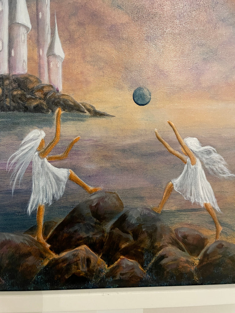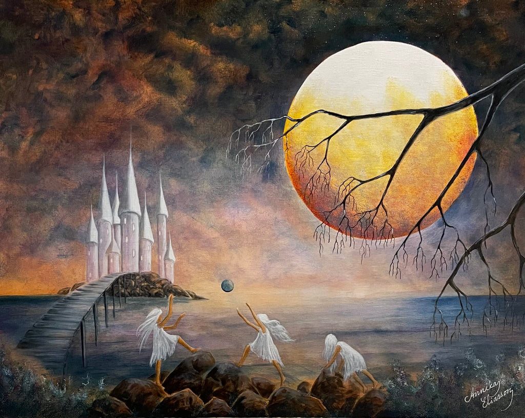 Långt bortom dimman låg Glasslottet, byggt av ljus och drömmar. När den stora månen vakade över havet lekte de tre små vid strandens stenar. De kastade en skimrande kula mellan sig, och varje skratt fick vattnet att glittra.