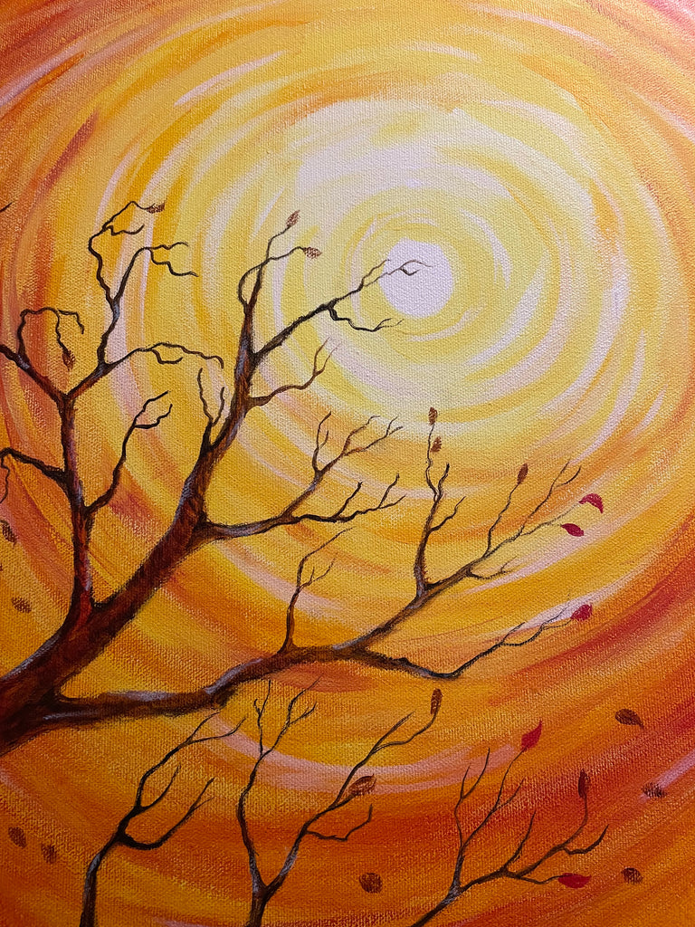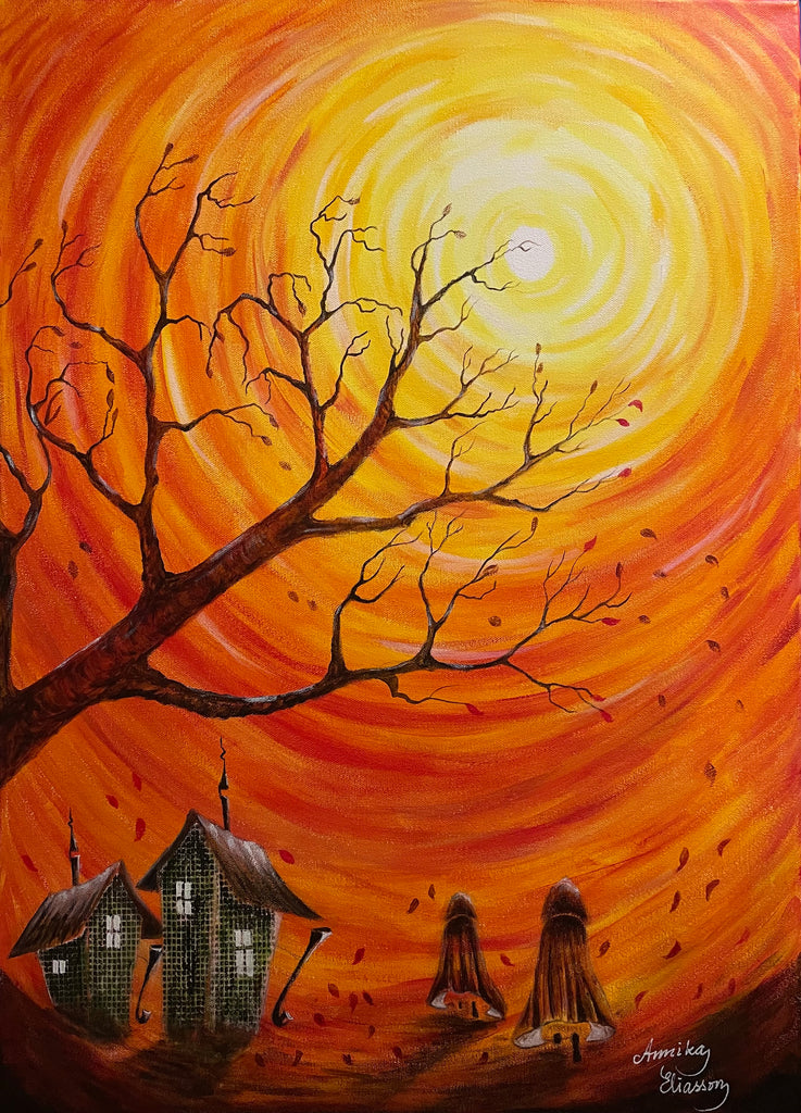 "Hösten visar sina  vackraste färger, träden sträcker sina nakna grenar mot den glödande solen. I den stilla höstvinden svävar de sista löven bort,