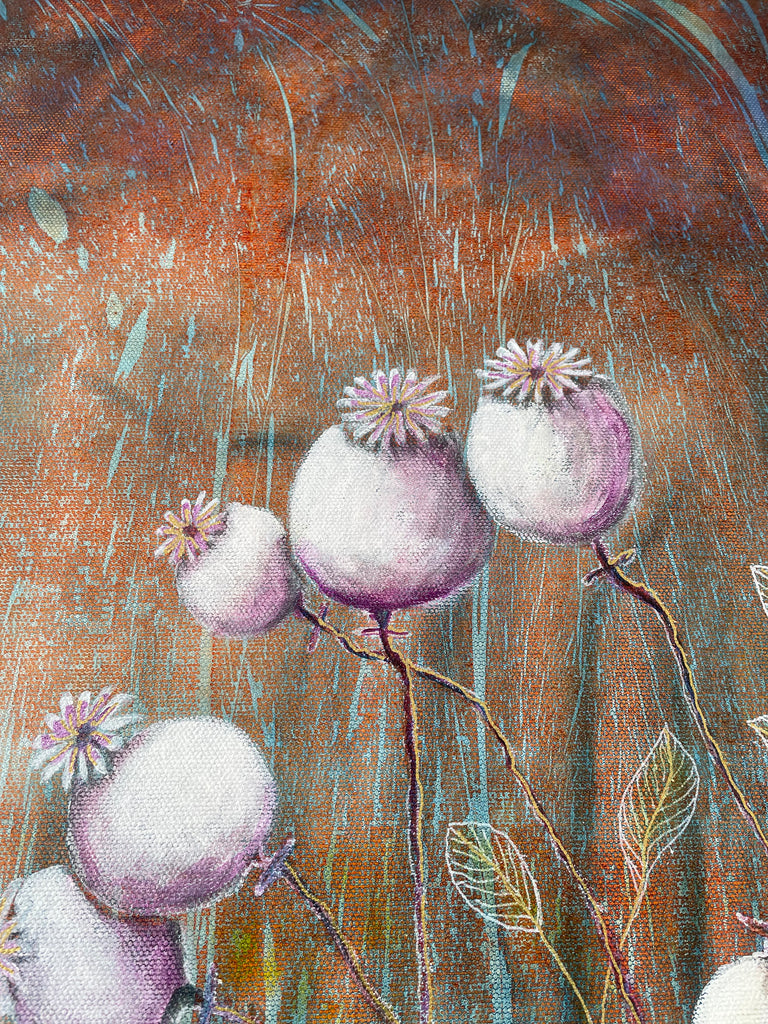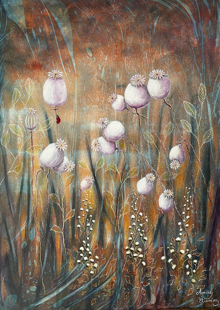 "Ute på fältet vajar vallmoblommorna fröhus, snart ska de små fröna skickas ut för vinden och nytt liv ska gro"