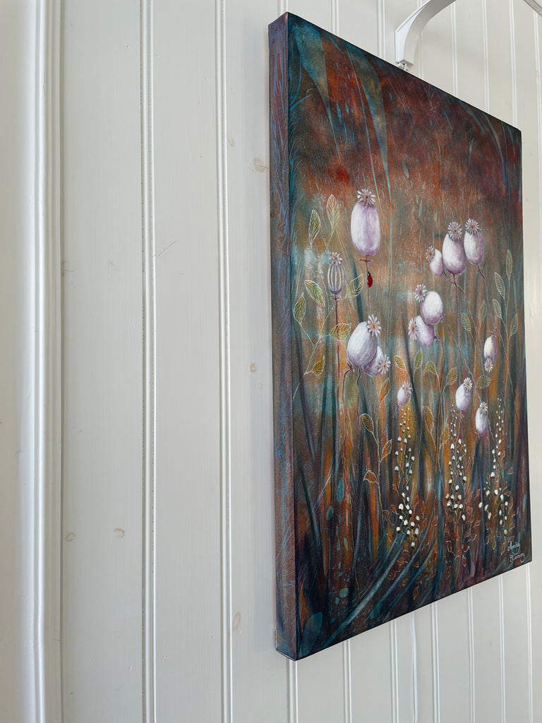 Original akrylmålning på 3D canvasduk, 70x50x3,5cm med målade kanter runt om och upphängningstråd, klar att hängas upp.